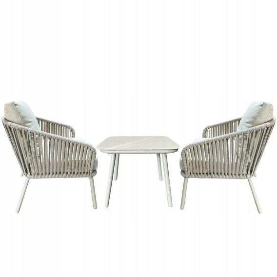 Solidnie wykonane i wygodne fotele oraz funkcjonalny stolik będą świetnym uzupełnieniem letniej strefy relaksu w ogrodzie, na tarasie, czy też na balkonie. Prosty design, metal oraz elegancki beż sprawiają, że meble wpasują się w każdy rodzaj otoczenia i nadadzą mu wyjątkowy charakter. Dzięki wytrzymałej konstrukcji komplet zostanie z Tobą na dłużej i będzie Ci służył wiele sezonów