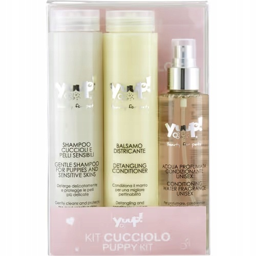 Kompleksowy zestaw YUUP! stworzony z myślą o szczeniętach i kociętach. Zawiera delikatne kosmetyki do pierwszych kąpieli i codziennej pielęgnacji, które wspierają komfort wrażliwej skóry i sierści młodych zwierząt. Idealny do użytku domowego i groomerskiego.